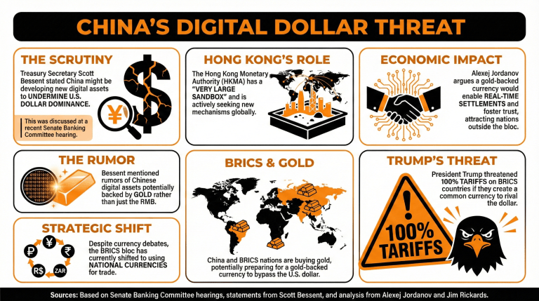 베센트는 중국이 미국의 금융 영향력을 약화시키기 위해 금 과 같은 원자재로 뒷받침되는 디지털 자산을 개발할 가능성이 있다는 소문이 있다고 언급했습니다. -